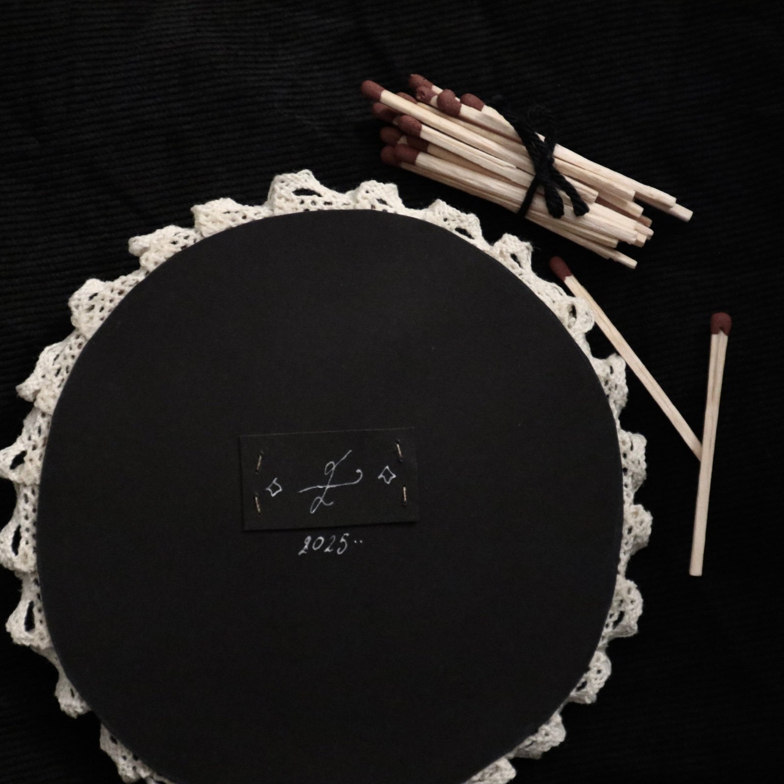 The lace is attached on the wood which can be used to hang it on a wall.